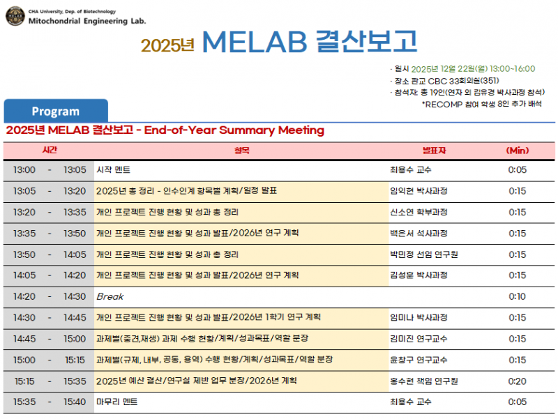 [MELAB] 2025년 결산보고 운영자 아이디로 검색 19시간 32분전 20 0 LV.1 73% - 첨부파일 : tt.png (70.8K) - 다운로드 0 2025-12-22 15:46:30 - 짧은주소 : http://mito.cha.ac.kr/mito/bbs/?t=af 주소복사 × 짧은 글주소 복사 복사하기 Note! '복사하기' 버튼을 클릭하면 내 컴퓨터 클립보드에 복사됩니다. 다음글 목록 본문 ## 2025년 결산 보고 (일정 요약)- 12월 22일 월요일 13:00 ~16:00- CBC 33회의실- 2025년 결산 / 2026년 계획 공유 댓글목록 0 등록된 댓글이 없습니다.