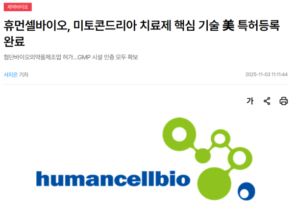 첨단바이오의약품 개발 전문기업 휴먼셀바이오는 미토콘드리아 치료제 핵심 원천 기술의 미국 특허 등록과 함께 식품의약품안전처로부터 첨단바이오의약품제조업 허가를 연이어 확보했다고 3일 밝혔다.휴먼셀바이오가 핵심 역량으로 내세우는 미토콘드리아 치료제는 미토콘드리아 이식을 통해…
